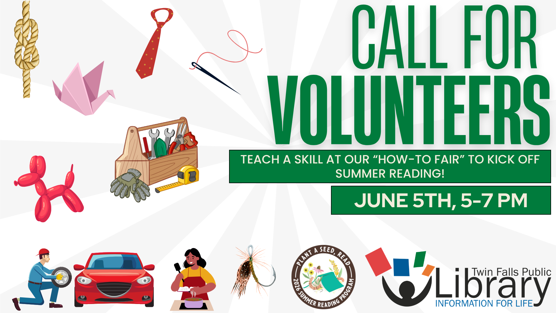 Do you have a special skill to share with others? A special talent or trick you'd like to teach to the community? Help kick off the Twin Falls Public Library’s Summer Reading Program - Plant A Seed, Read - on June 5th, from 5 - 7 PM at our How-To Fair!
