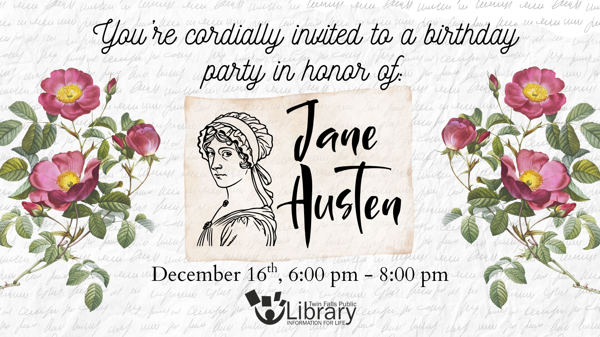 You're cordially invited to join us for an evening celebrating Jane Austen's 250th birthday on Tuesday, December 16th, 6-8 PM. We'll have crafts, games, trivia, tea, and light refreshments, all in honor of one of the world's most endearing, and enduring, authors. Dress in Regency costume if you like!